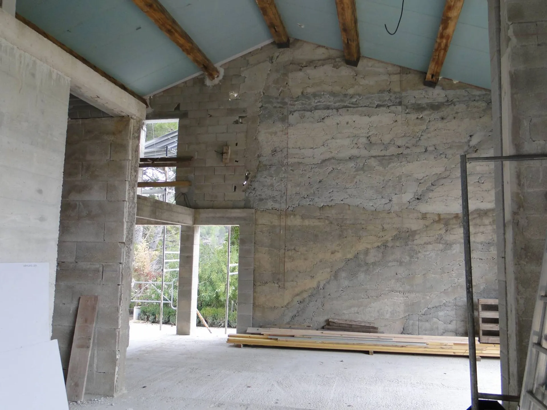 L'intérieur bénéficie notamment de charpentes en bois laissées apparentes dans les pièces à vivre à double hauteur. L’utilisation de panneaux de toiture à isolation intégrée permet à la fois d’apporter de la lumière naturelle et d’assurer une isolation thermique optimale. Les cloisons sont réalisées avec différents types de briques, un choix esthétique et pratique qui valorise les matériaux locaux.