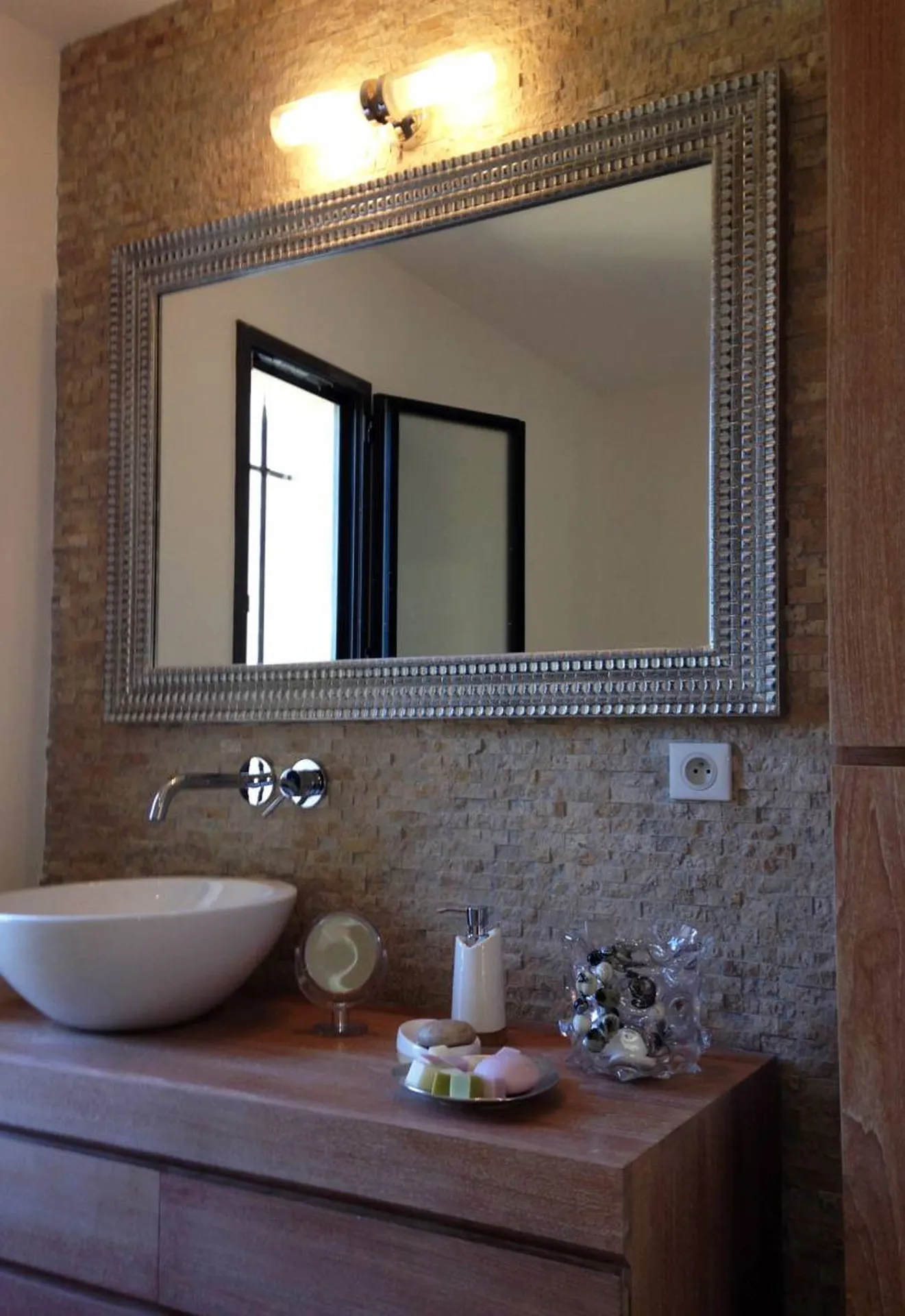 Le choix des revêtements pour les sols et les mosaiques, s'est tourné vers une pierre naturelle sobre, claire et facile d'entretien : le travertin. Cela a permis à la cliente d'obtenir une bonne harmonie avec son mobilier à la fois rustique et contemporain.