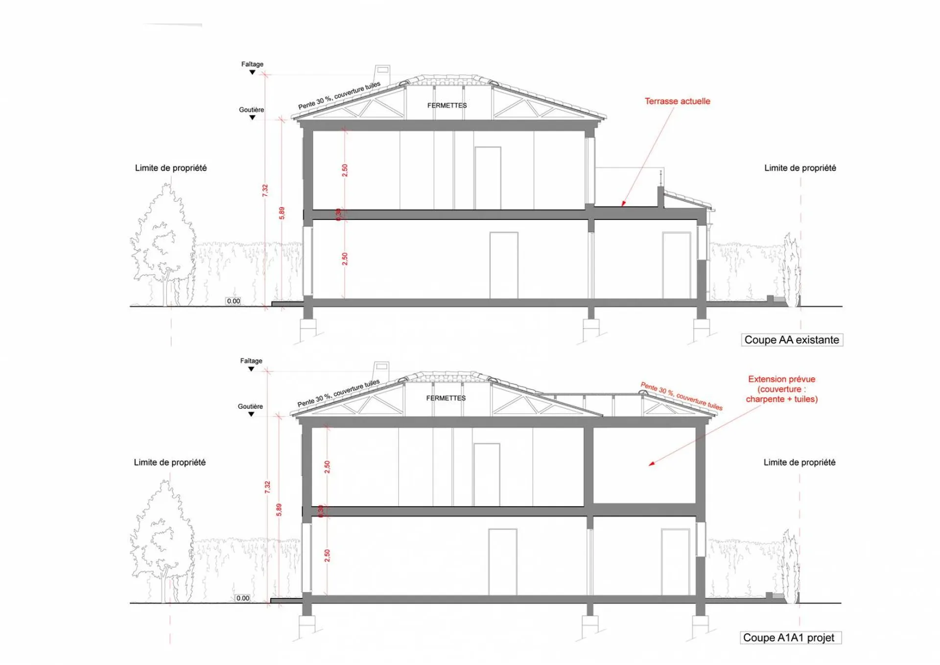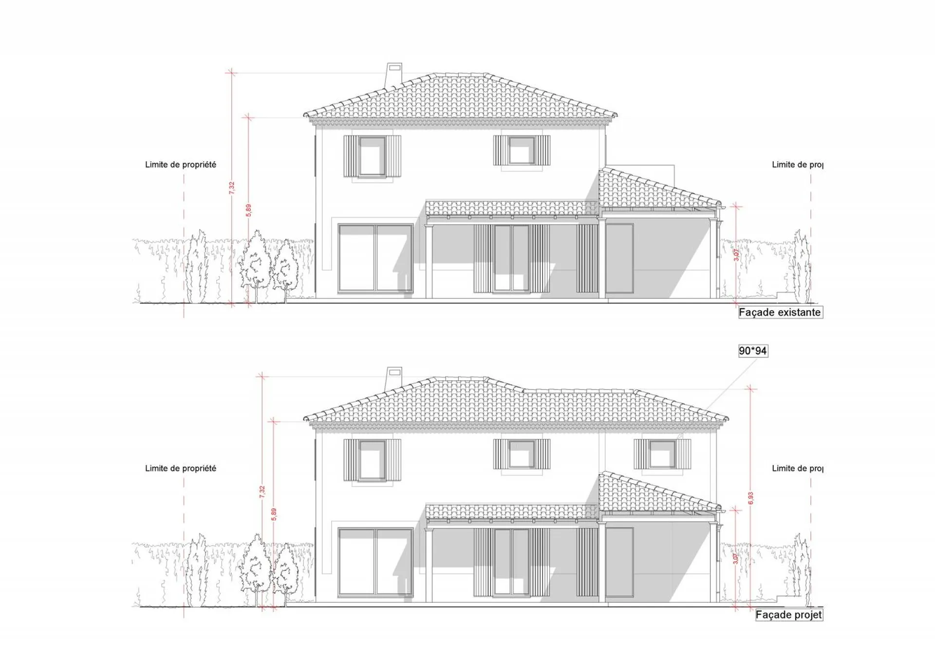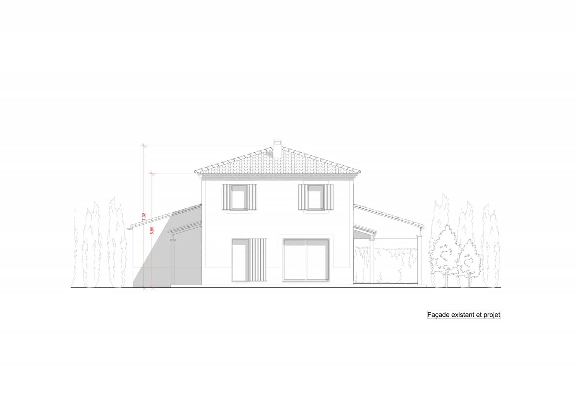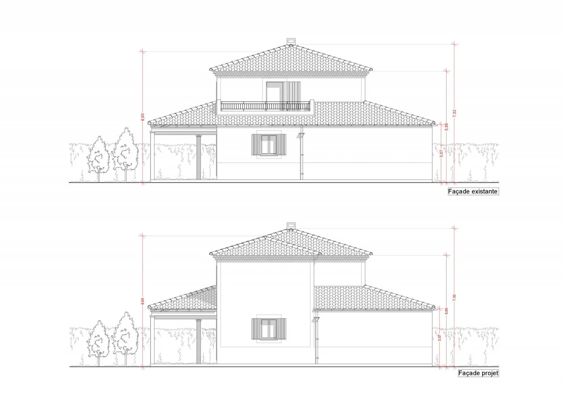 Cette extension s'était implantée dans l'emprise de la terrasse existante de l'étage, afin de créer une chambre supplémentaire. Ce projet d'extension de villa individuelle nécessitait la réalisation d'un dossier de déclaration préalable de travaux. Les établissements Philippe Serre ont réalisé le dossier complet de cette dernière, de l'état des lieux à la conception du projet.