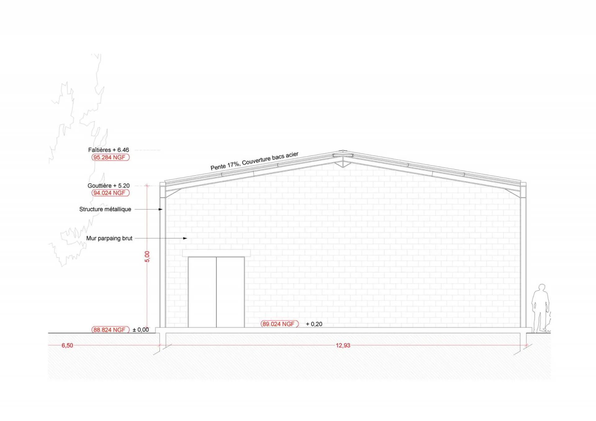 Le hangar agricole a été réalisé en ossature métallique et de blocs de béton. La toiture a été prévue à deux pentes avec une couverture en bac acier de couleur terre cuite.