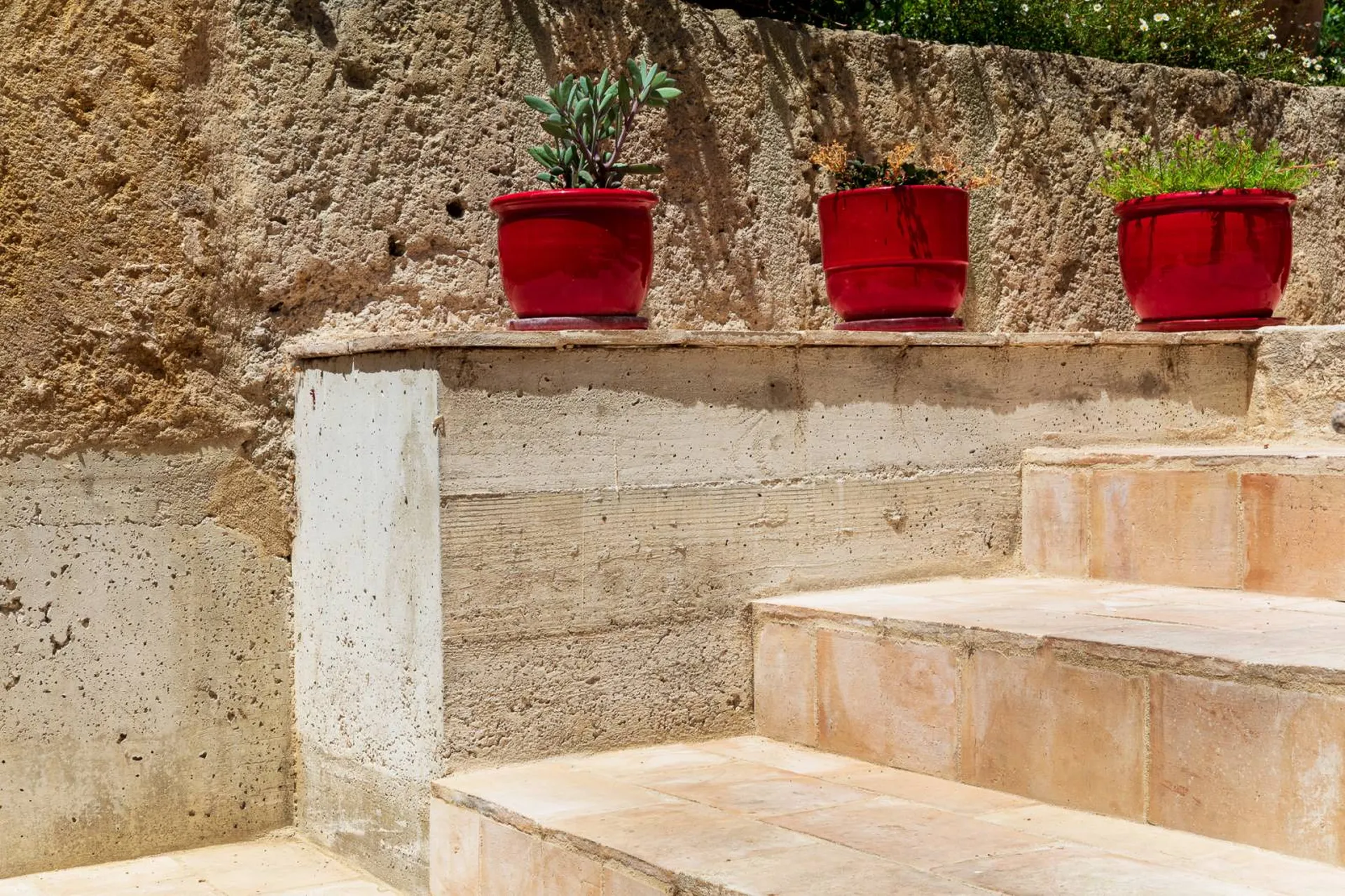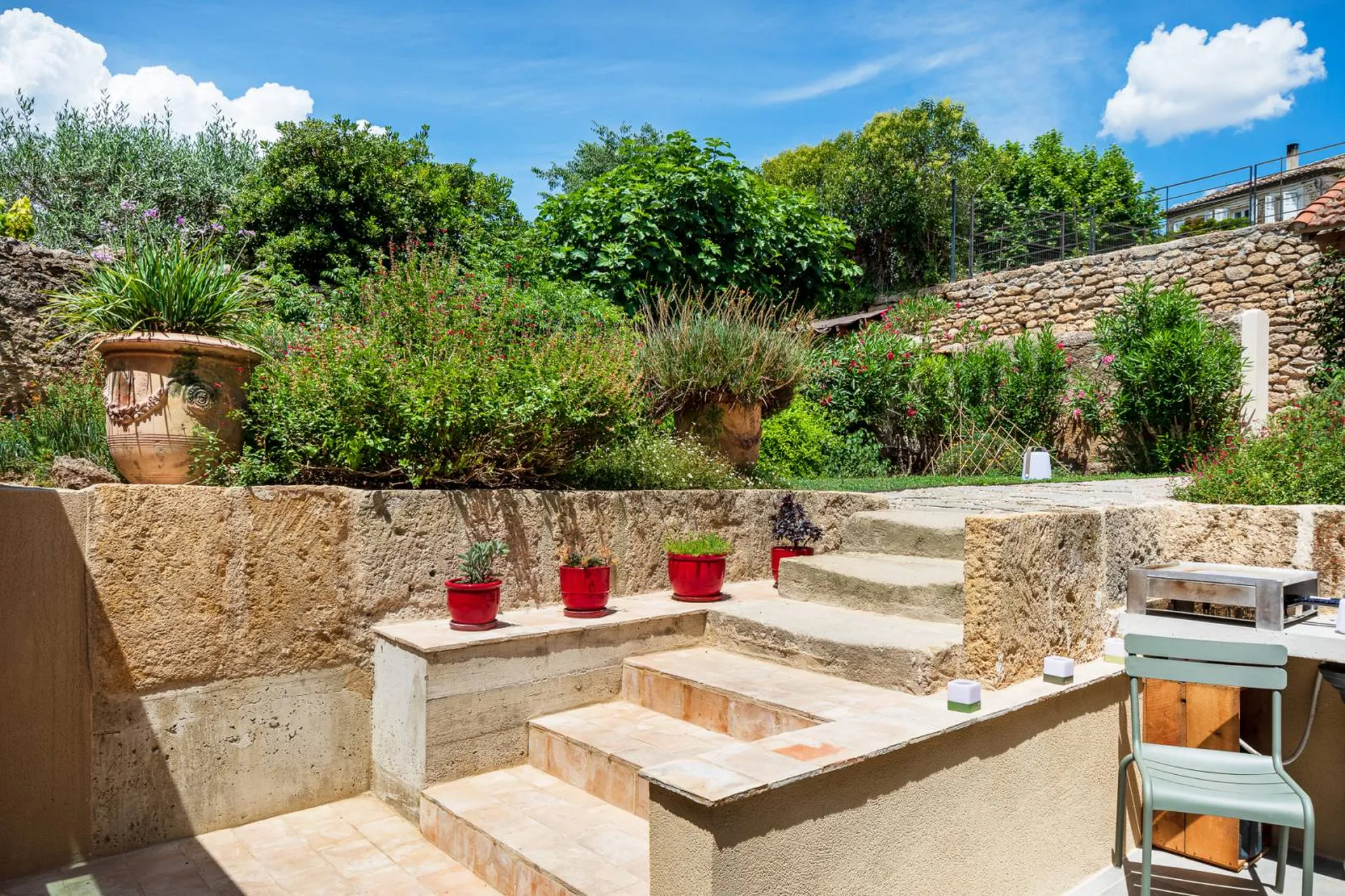 Pour les deux dernières marches, nous avons utilisé deux anciennes marches en pierre monobloc, posées sur une assise en béton.