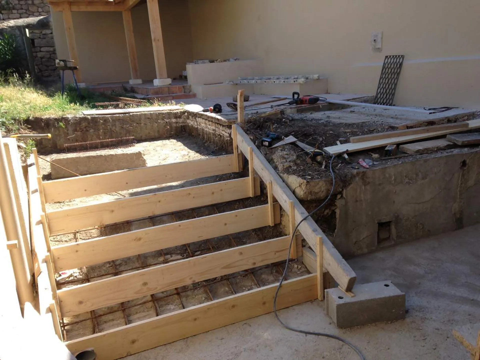 Nous avons réalisé cet escalier extérieur avec des marches profondes et de faibles hauteurs : il a fallu démolir l'aménagement existant et créer le nouvel escalier en béton coffré.
