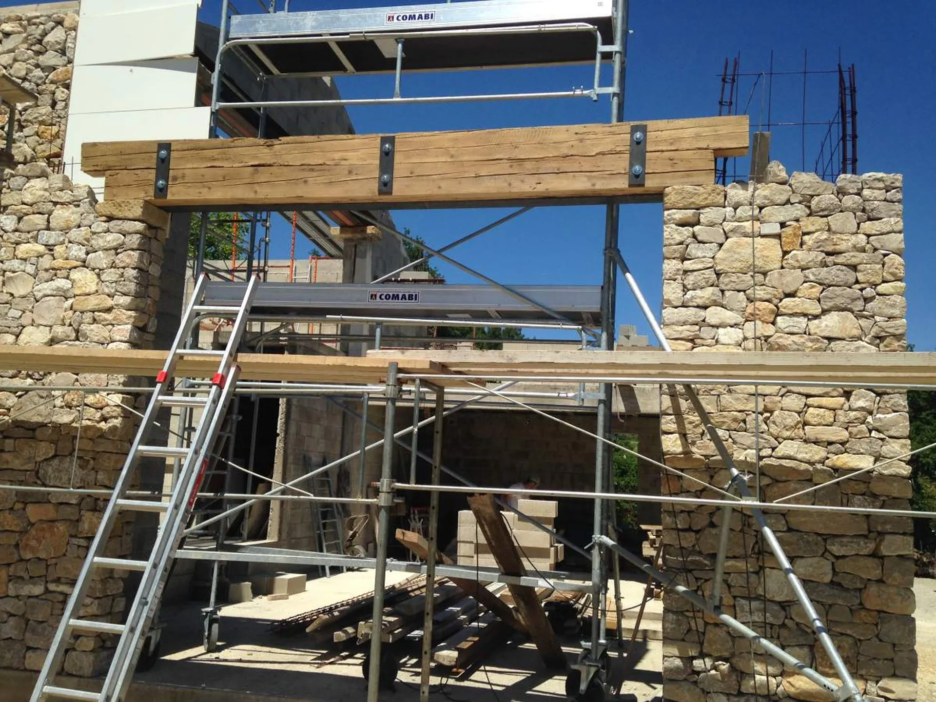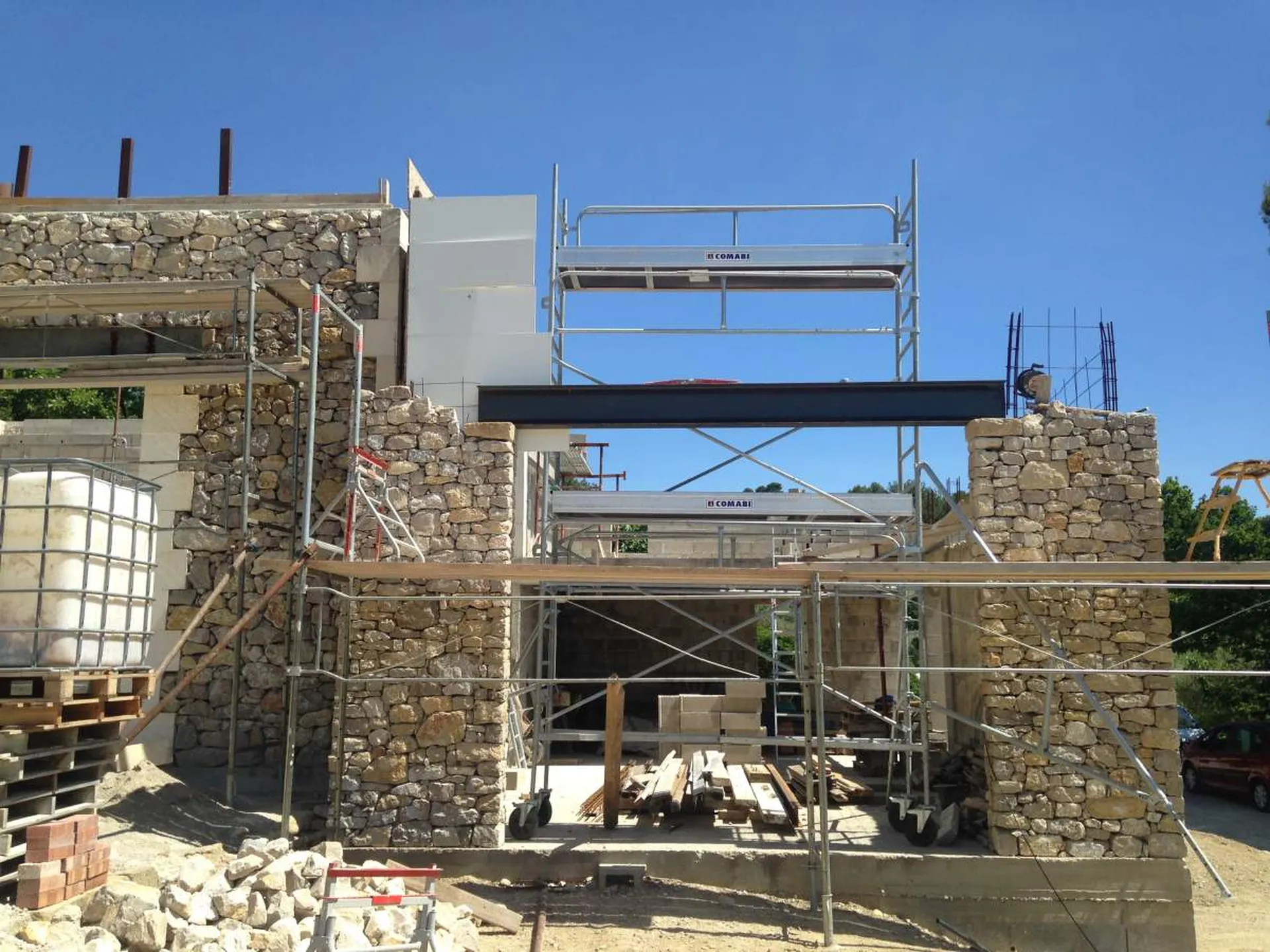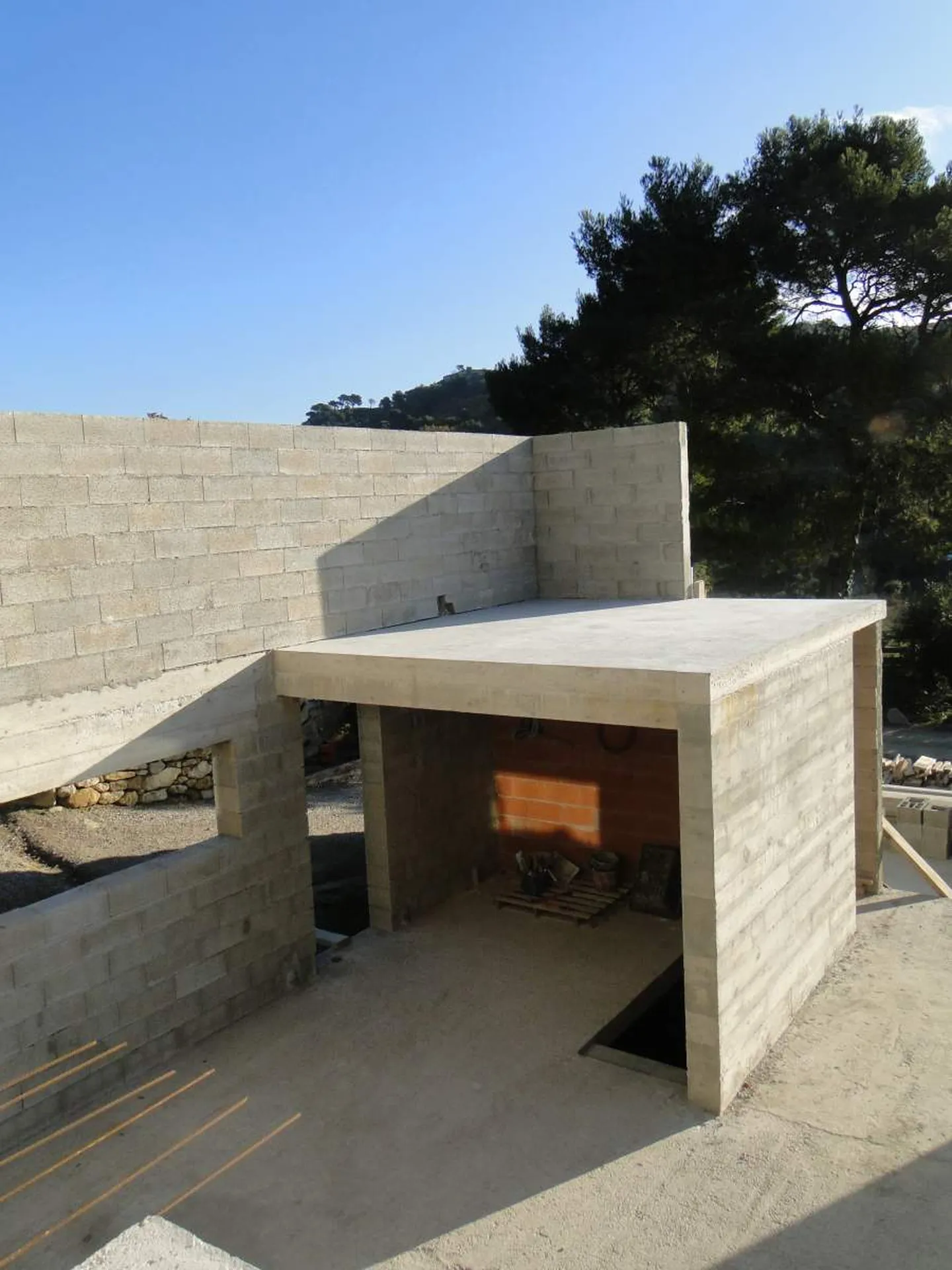 L'élévation des murs est réalisé par le montage à sec de pierres calcaire du pays salonais qui sont coulées dans un voile de béton armé sur les faces intérieures.