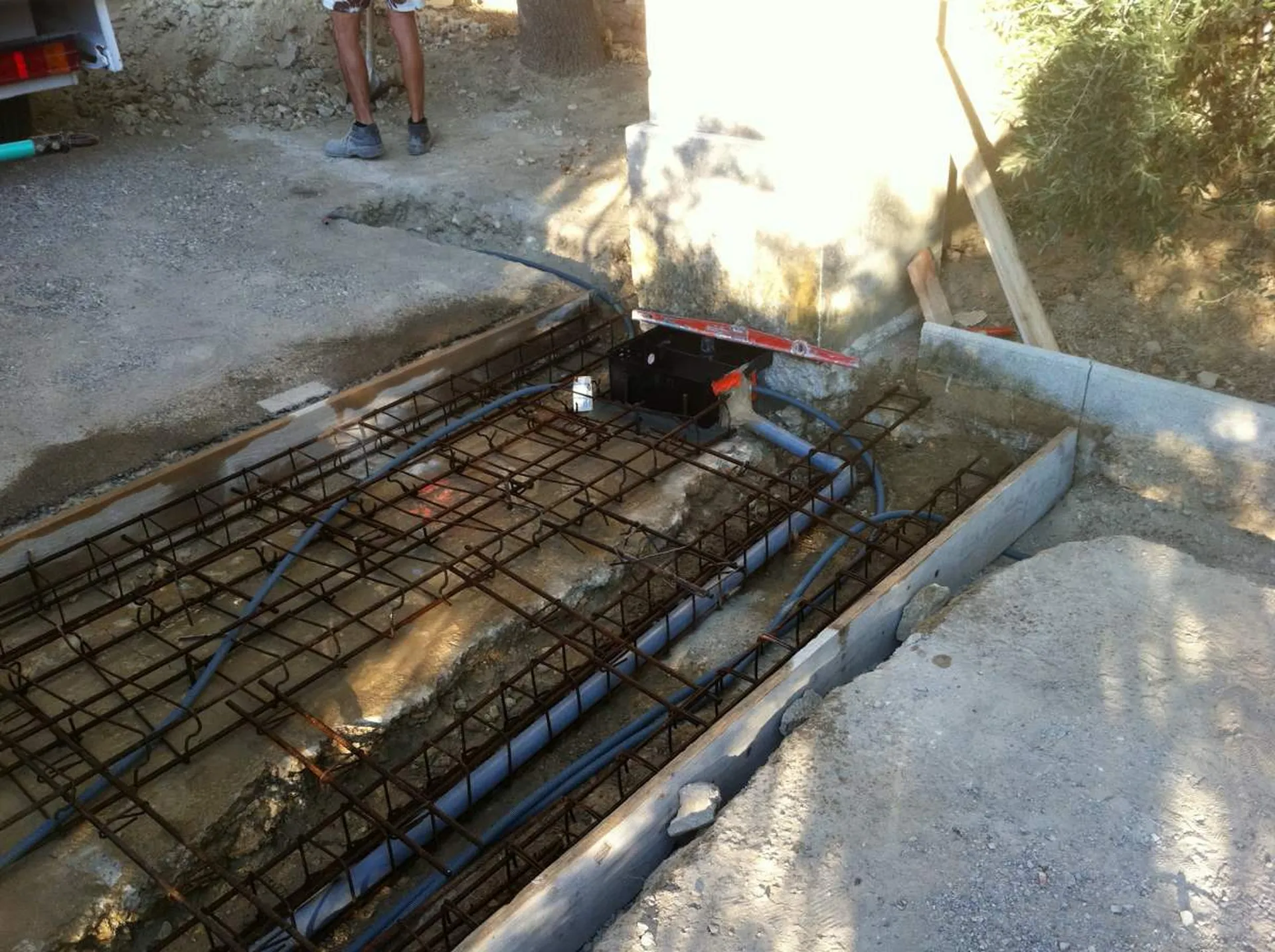Pour la motorisation, des automatismes à pivots ont été installés directement dans la longrine reliant les deux piliers, offrant une solution technique efficace tout en restant très discrète. Un petit local technique couvert a également été aménagé à proximité afin d’abriter les boîtiers de commande du portail ainsi que la centrale d’éclairage extérieur.