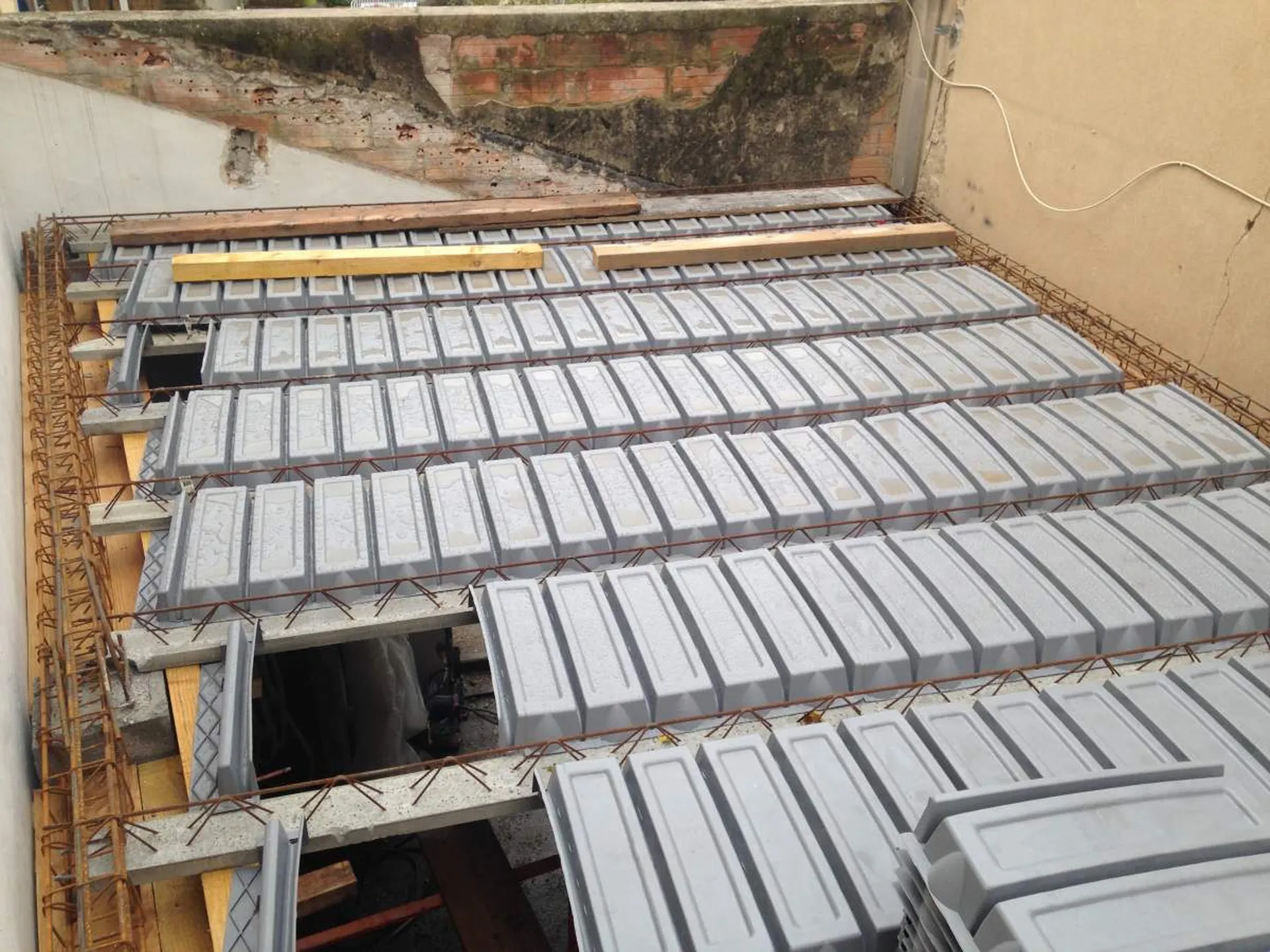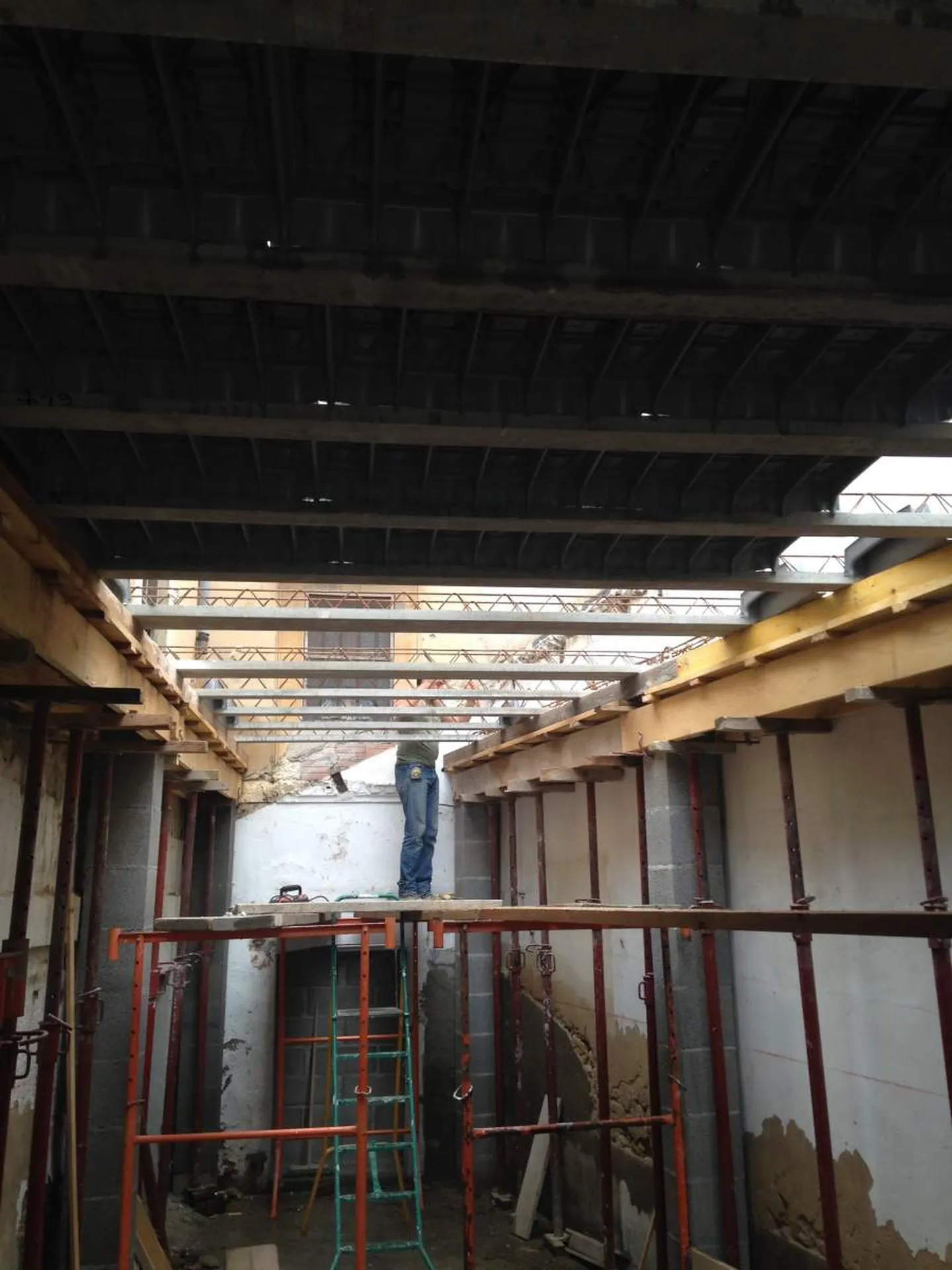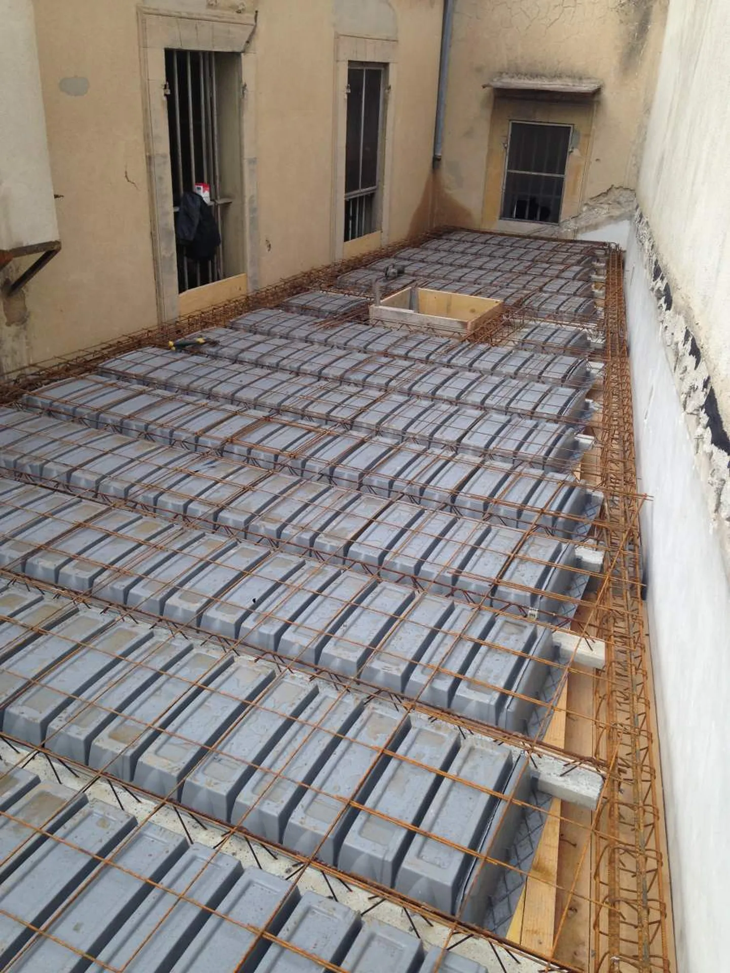 - élaboration du plancher du toit terrasse: poutrelles en béton préfabriquées et ourdis polyéthylène, mise en place de trémie pour le futur skydôme, armature métallique
