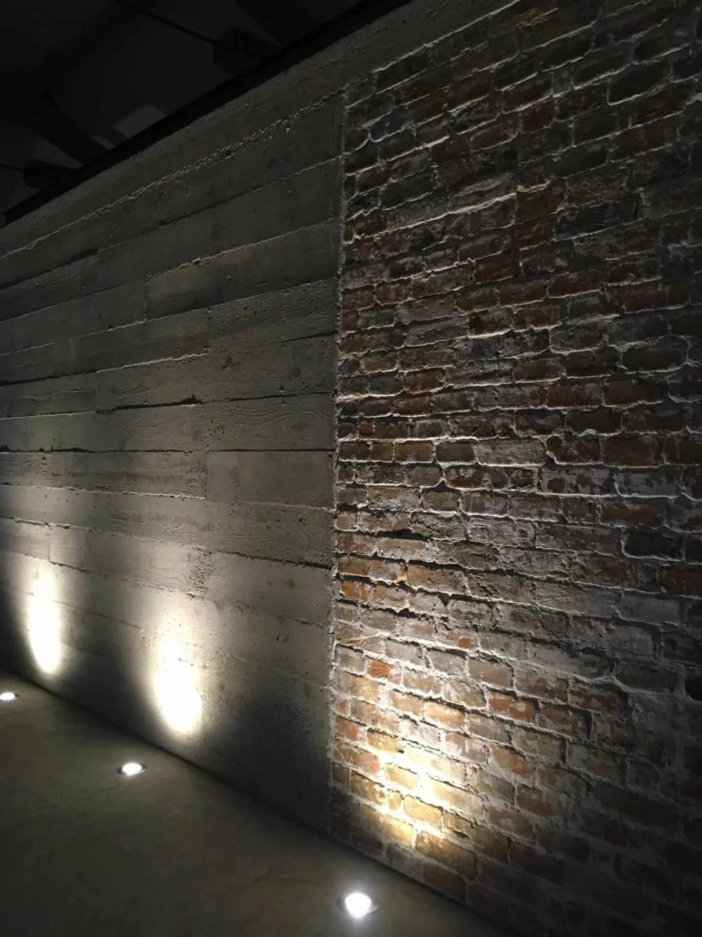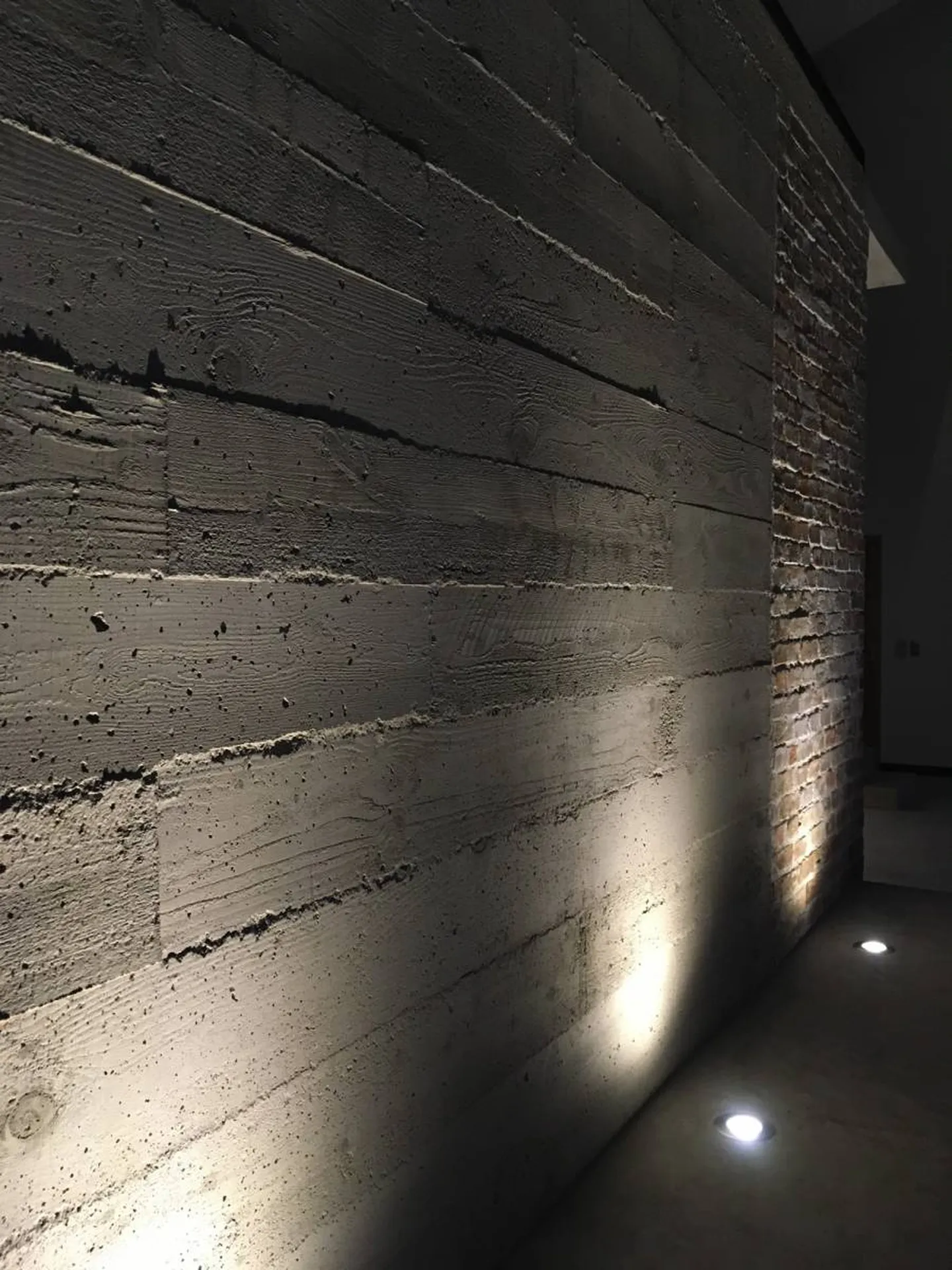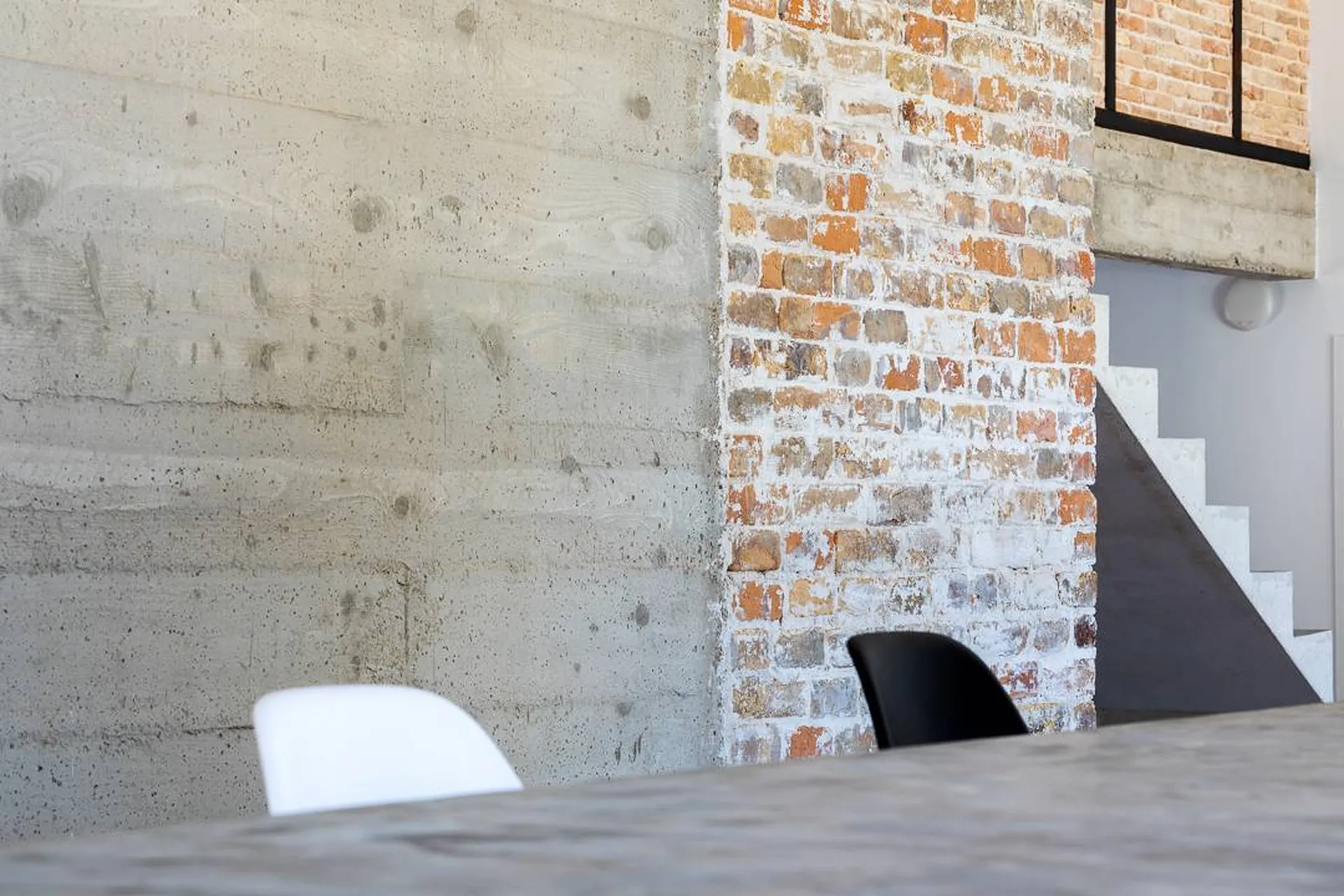 Dans l'espace de vie, un mur distinctif a été conçu en juxtaposant des briques anciennes aux teintes nuancées de brique et marron, avec du béton brut de décoffrage. Ce mur, véritable pièce décorative, contraste avec les murs blancs minimalistes de la maison. Étant situé dans le passage le plus fréquenté de la maison – entre la cuisine, la salle à manger, les salons, le bureau et les chambres – ce mur est à la fois esthétique et fonctionnel, étant peu salissant.