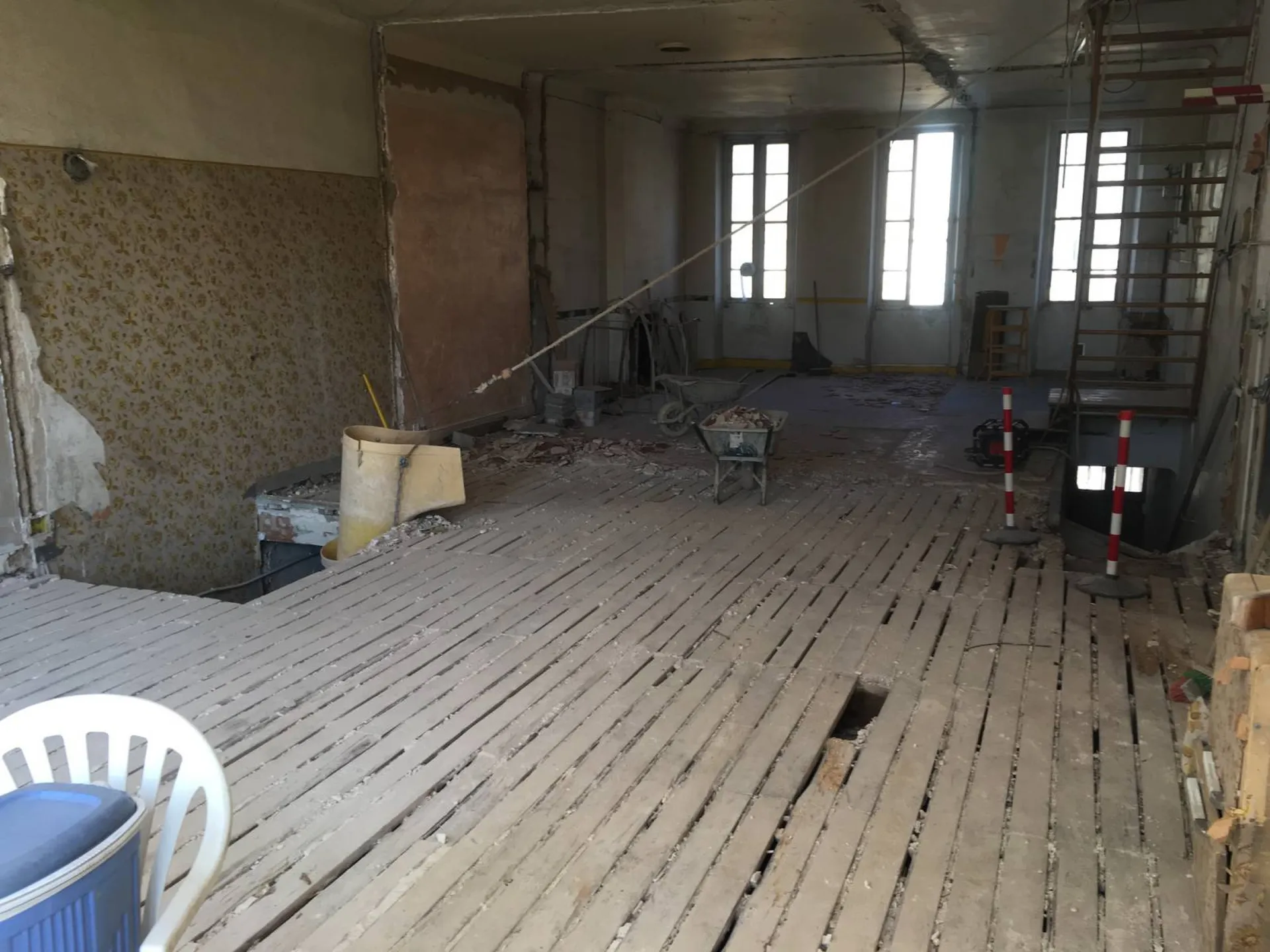 gros oeuvre (toiture, planchers intérieurs à renforcer ou à modifier, ouverture de murs porteurs, escaliers à créer...), des cloisonnements, des travaux de placo plâtre, de plomberie, d'électricité, de peinture, des carrelages, des menuiseries extérieures, des enduits extérieurs ...