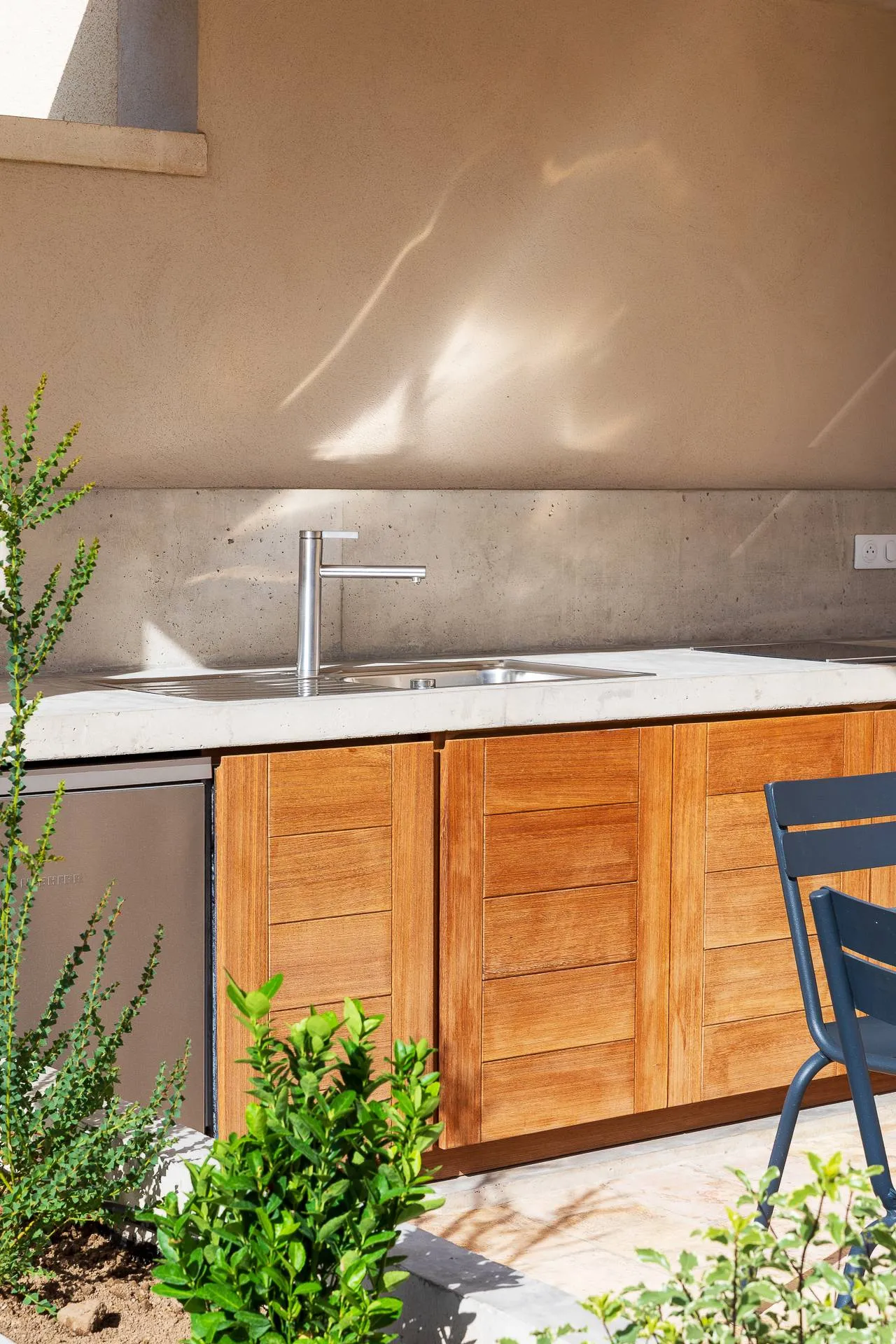 Dans ce cadre, nous avons conçu et réalisé un plan de travail ainsi qu’une crédence en béton brut de décoffrage lisse, offrant une finition sobre et élégante, parfaitement adaptée à un usage extérieur. Des jardinières monoblocs ont également été créées en bordure de la terrasse. Celles-ci ont été réalisées en béton brut de décoffrage avec une finition texturée sur les faces extérieures, obtenue par l’utilisation de planches, tandis que l’intérieur a été laissé lisse afin de faciliter l’entretien et la mise en place des plantations.