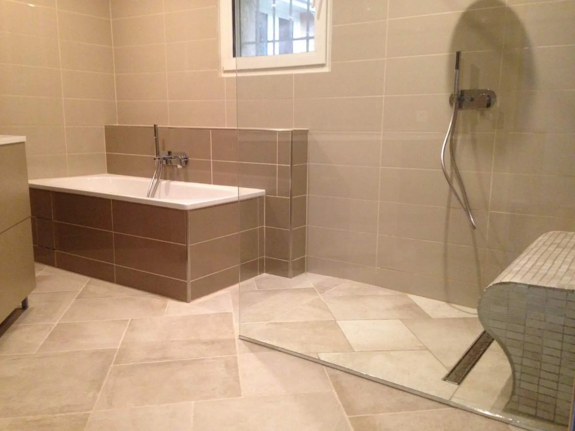 Nous avons posé un plan de travail moulé en une pièce avec double vasque et réalisé un receveur à l'italienne avec un banc.