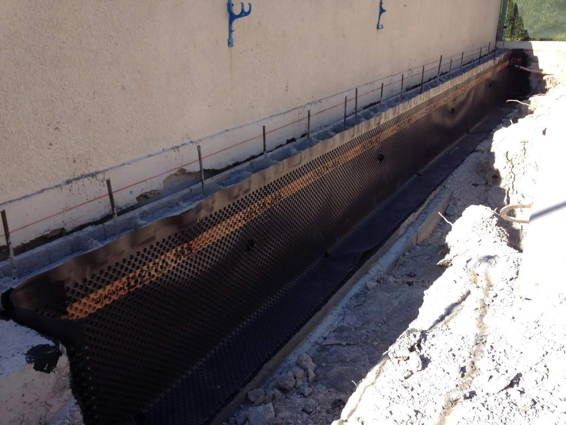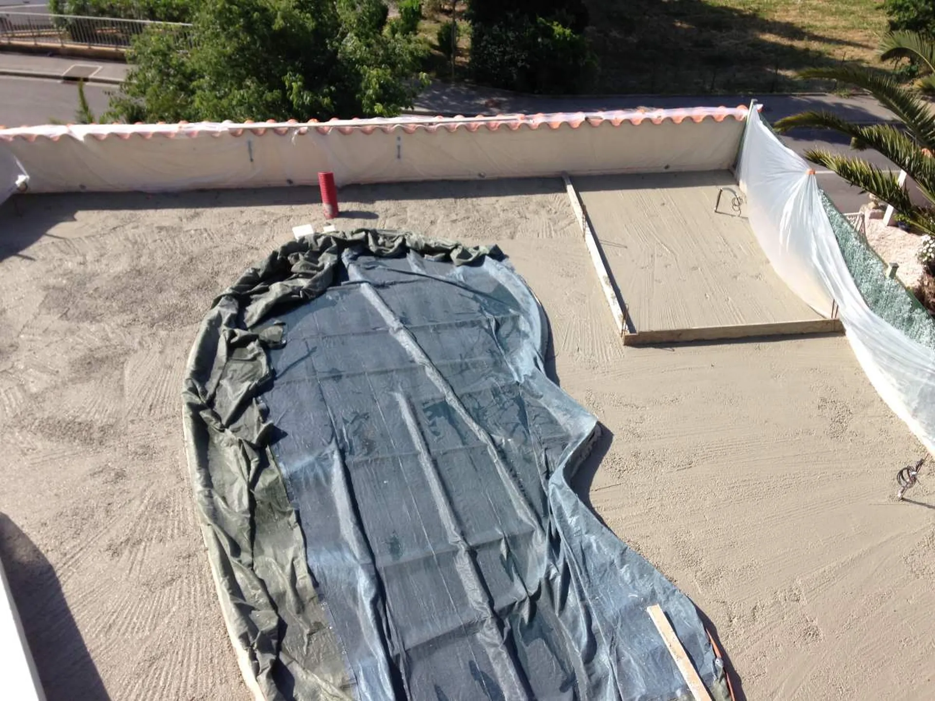 - Démolition du revêtement existant, des balustrades et des murets : il a fallu reprendre intégralement les terrasses supportant la piscine coque, pour se faire il a fallu déposer la piscine au moyen d'une grue nous permettant ainsi de réaliser un nouveau mur de soutènement (côté rue).