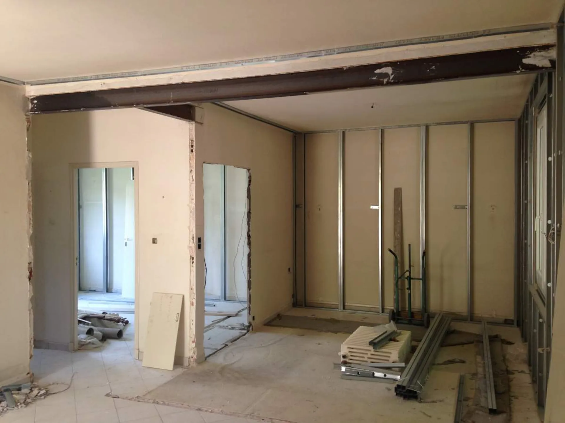 Nous avons démoli les cloisons intérieures, puis mise en oeuvre de poutres métalliques pour conserver les plafonds existants.